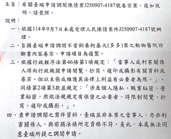 動保處回應有近期該飼主8月就醫紀錄,民眾與動保處約定時間前往查看事證。