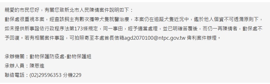 新北動保處直接說謊,說狗被帶離外縣市想因此結案,其實狗被飼主帶走,飼主住處依然在新北市,所以通報人直接請網友幫忙寫信讓事件不要沉下去