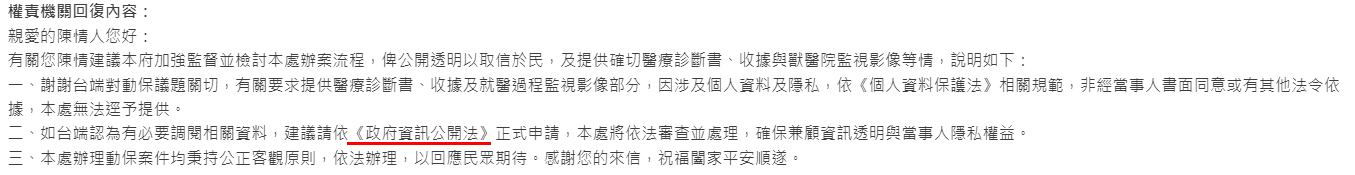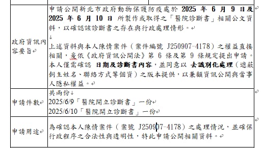 ●筆者依照動保處要求的《政府資訊公開法》申請事證,並表明同意「去識別化處理」